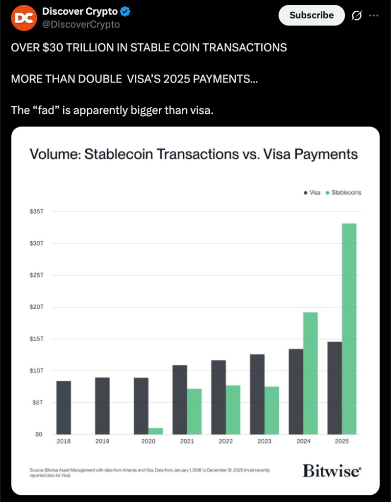 Thirty-three trillion dollars is not a small number, and when it shows up in stablecoin volume, it stops being a niche crypto stat and starts looking like global finance. Stablecoins processed more value in 2025 than Visa, which sounds dramatic… because it is.