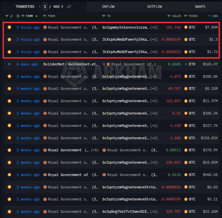 Bhutan has quietly been reducing its Bitcoin exposure, and the pace is starting to raise eyebrows. Recent on-chain data shows the country moved another 102 BTC, worth nearly $8 million, adding to a steady stream of sales throughout the year.