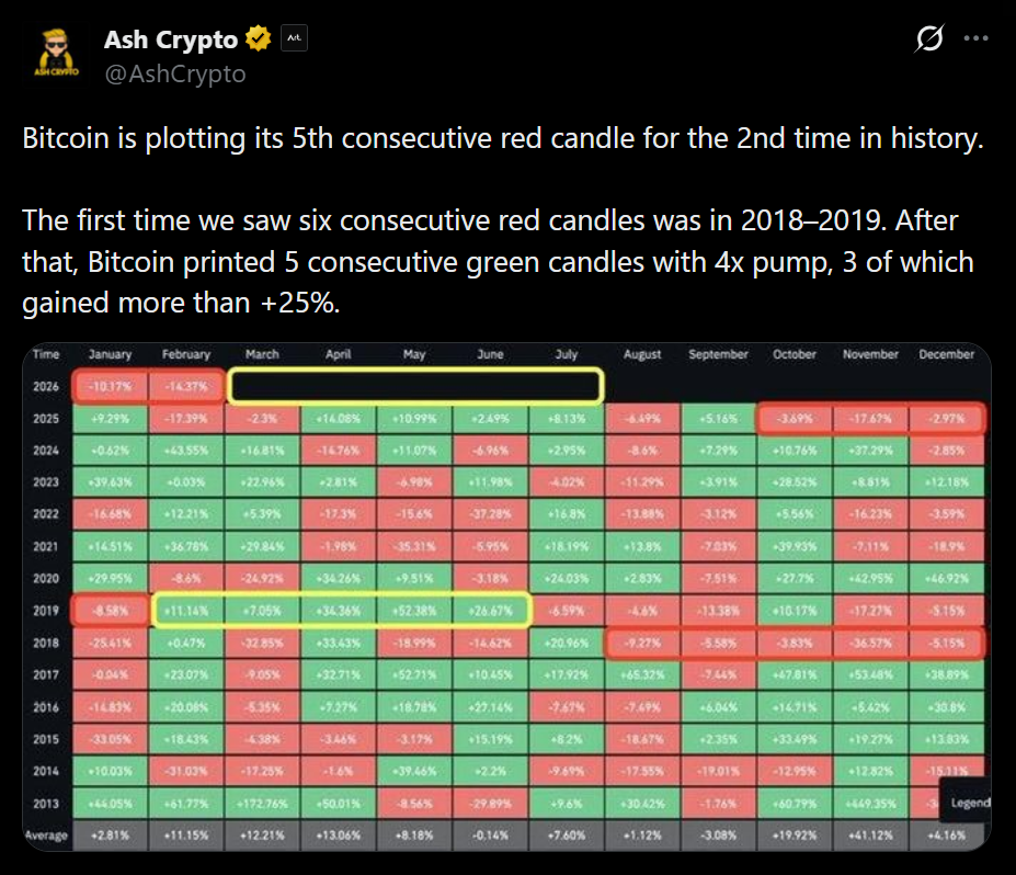 According to data highlighted by Ash Crypto, the last time Bitcoin experienced such a prolonged monthly losing streak was during the brutal 2018–2019 bear market. Back then, sentiment was crushed. Confidence evaporated. And yet, what followed caught almost everyone off guard.