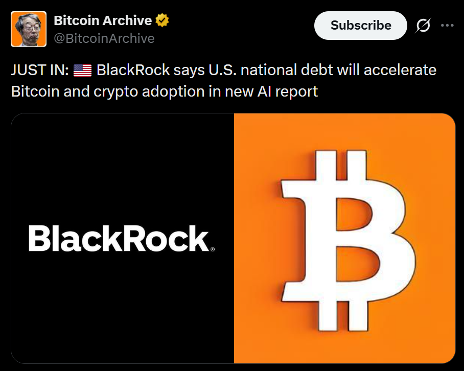 BlackRock’s research warns that increasing government borrowing will make the financial system more vulnerable to shocks — from bond yield spikes to policy conflicts between inflation control and debt servicing. The report argues that long-term Treasuries, historically the bedrock of global stability, are weakening under the weight of rising leverage and macro tension. In this type of environment, institutions may shift toward alternative hedges like Bitcoin, particularly as confidence in traditional safe-haven assets erodes.