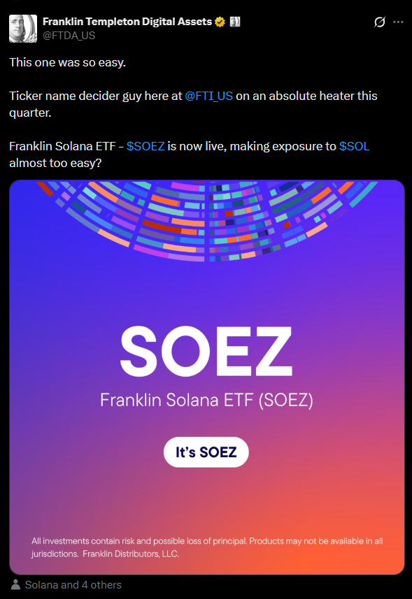 The post Franklin Templeton Launches Solana ETF on NYSE Arca as Institutional Demand Grows – Here Is What SOEZ Offers first appeared on BlockNews.