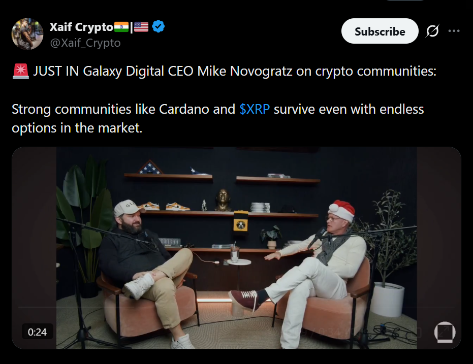 Novogratz directly questioned whether Ripple and Cardano can maintain their positions as the market matures. He acknowledged the strength of their communities, but suggested that community alone may not be enough in a market with expanding options.