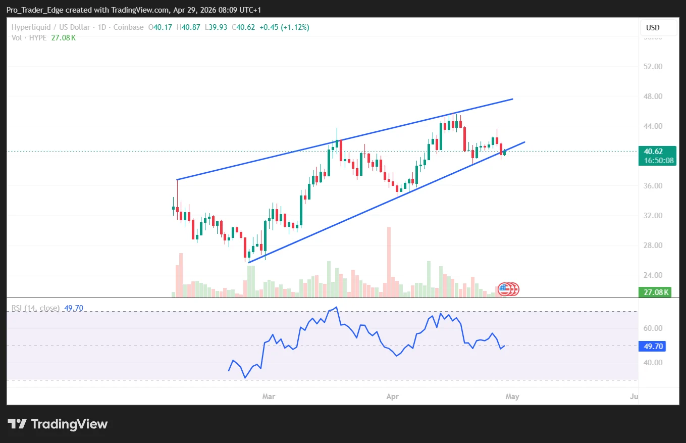 The token presently maintains support above the ascending trendline at $41.21. Should HYPE register a daily candle close beneath this threshold, the 50-day EMA at $38.98 would emerge as the subsequent support target, followed by the 200-day EMA at $34.90 as the next critical level should downward pressure intensify.