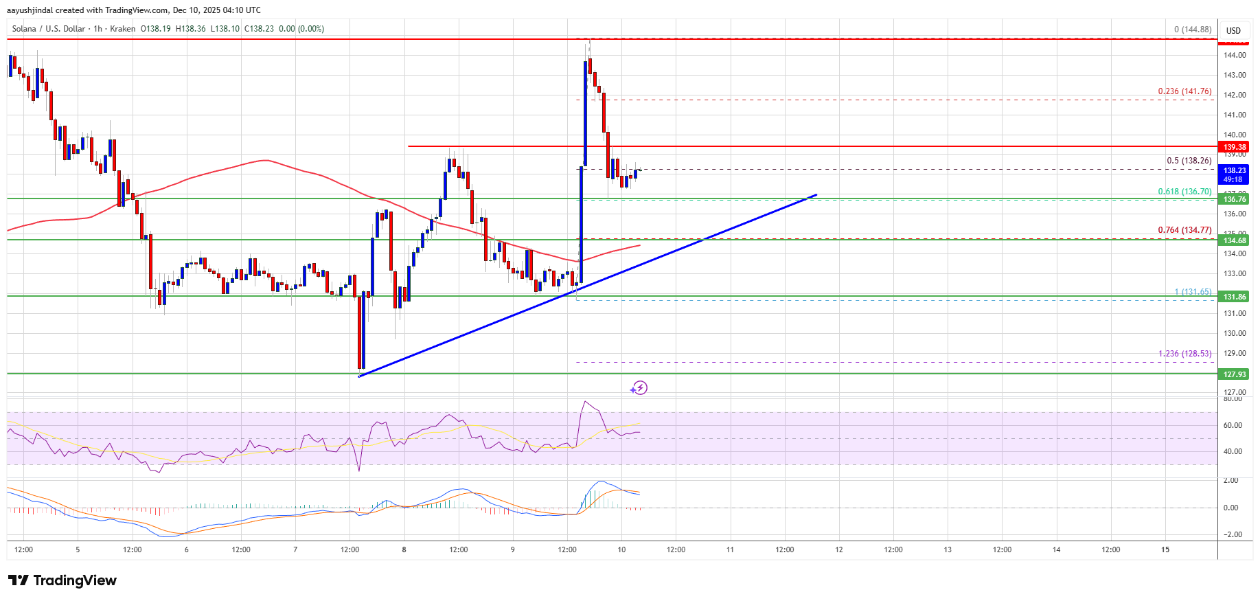 If SOL fails to rise above the $142 resistance, it could start another decline. Initial support on the downside is near the $136 zone and the 61.8% Fib retracement level of the upward wave from the $131 swing low to the $145 high. The first major support is near the $135 level and the trend line.