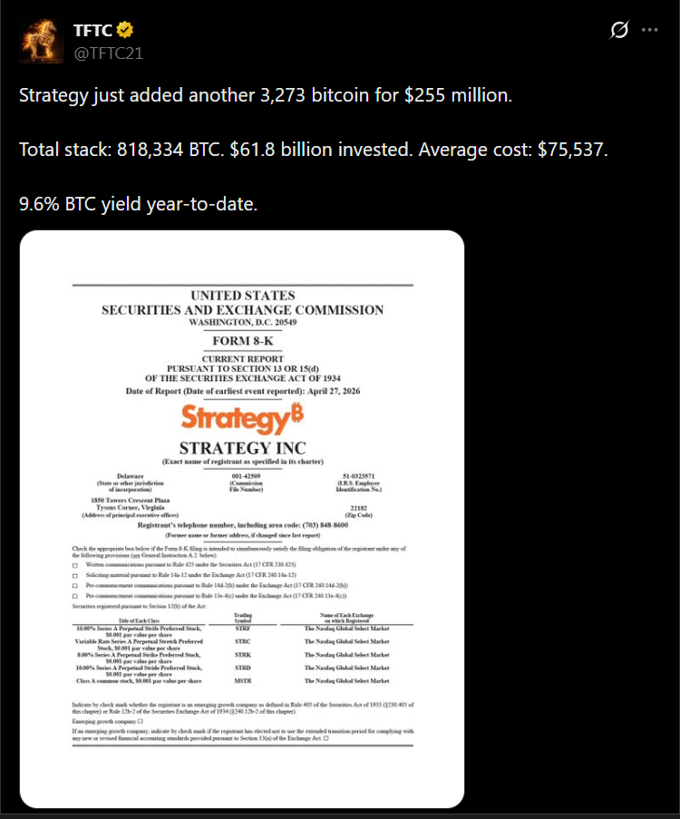 - Strategy buys 3,273 BTC for $255M, pushing holdings above 818K coins