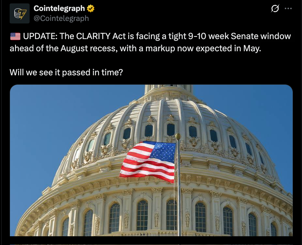 The CLARITY Act is running out of time, and not in a subtle way. With a Senate markup expected in May and the August recess approaching fast, lawmakers effectively have a narrow 9 to 10 week window to push the bill forward or risk losing it entirely.