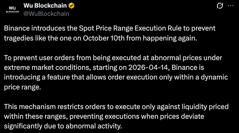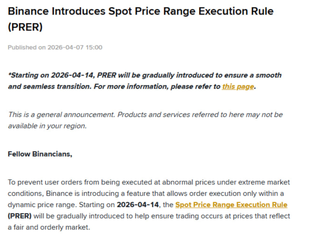 Binance is quietly rolling out a change that most traders won’t notice, until they really need it. Starting April 14, the exchange will introduce the Spot Price Range Execution Rule, or PRER, a mechanism designed to stop orders from filling at extreme prices during volatile market conditions. It’s not flashy, but it addresses a very real problem.