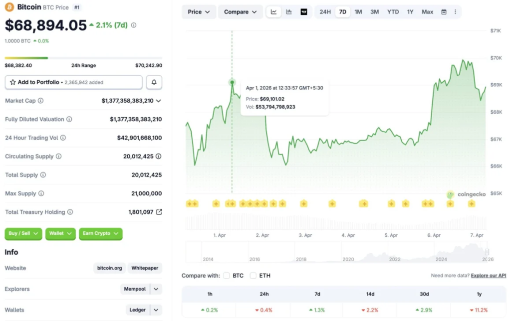 Bitcoin is once again running into the same wall, and it’s starting to feel a bit more serious this time. The asset has been rejected near the $69,000 to $70,000 range, slipping slightly over the past 24 hours and extending a broader pullback that’s been building for months. What used to be resistance around $72,000 to $73,000 has now shifted lower, and that change isn’t exactly comforting.