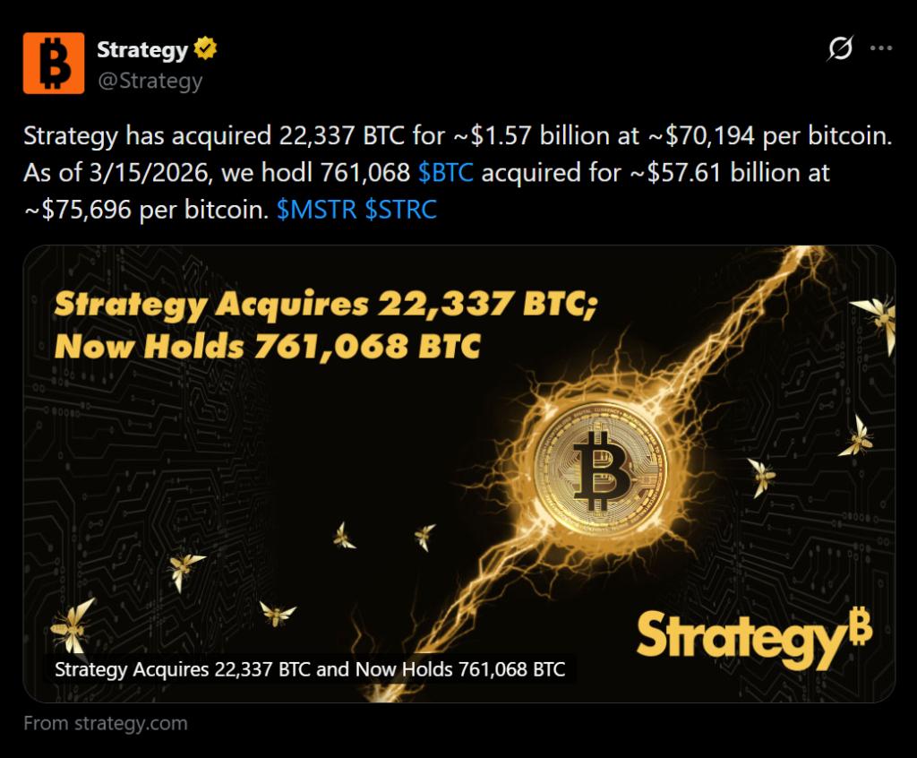 Strategy, the Virginia-based company that has become the largest corporate holder of Bitcoin, has significantly expanded its BTC treasury once again. The firm disclosed in a new regulatory filing that it acquired 22,337 Bitcoin during the week ending March 15, spending roughly $1.6 billion on the purchase.