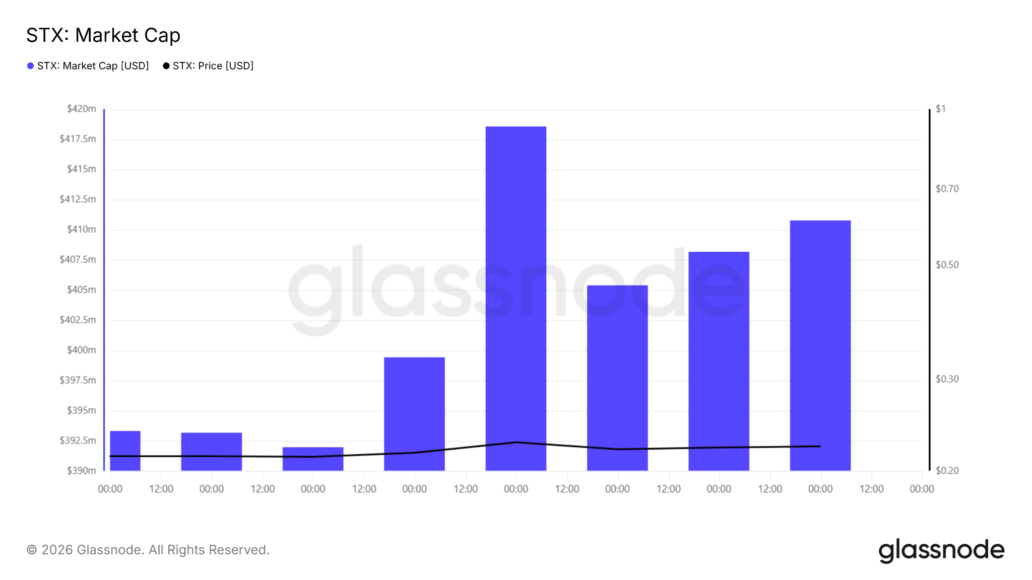 As can be seen from Glassnode data, there is a steady increase in the capitalization of the STX market despite low price development. The inconsistency of market capitalization increase relative to price growth can indicate accumulation. Bars for market capitalization show constant growth trends, while price activity develops in a specific range.