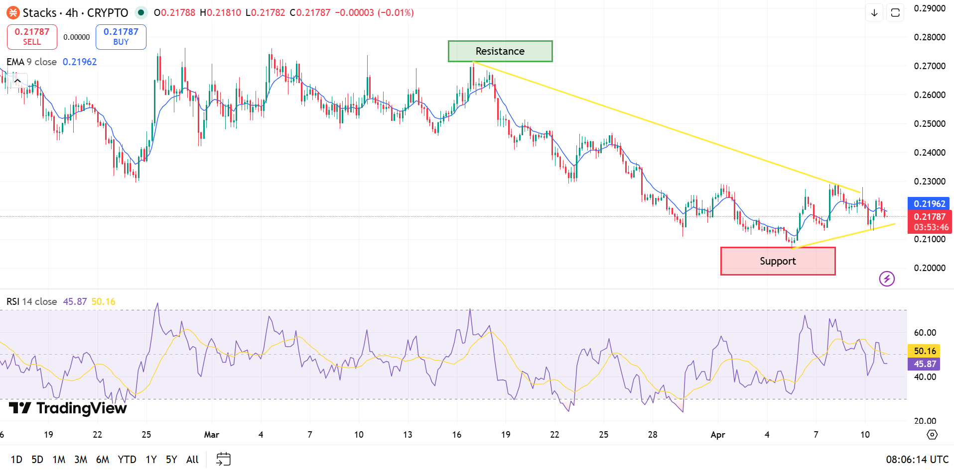 According to information gathered, STX is seen trading at levels around $0.21 while developing a narrowing price range. This is because the price movement consists of declining highs and rising lows, which form a symmetrical triangle shape on a lower time frame chart.