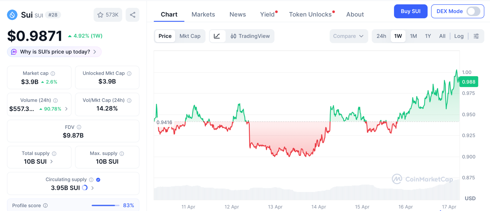 The SUI price prediction gained fresh weight this week when 21Shares listed TXXS on Nasdaq, a 2x leveraged ETF that marks the first product of its kind tied to SUI on a major US exchange. SUI sits at $0.95 with a 0.2% daily move, still down 82% from its $5.36 peak in January 2025.